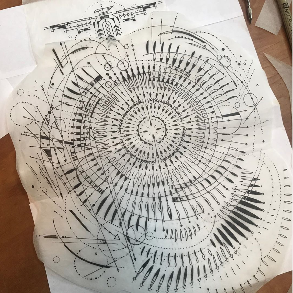 Lynne introduced me to the second character in this story named Kris D just over a year ago. It was such an honor, although Lynne didn’t know I’d had his art on my wall for more than a decade. Kris is an insanely talented artist and beautiful person. His patterning [depicted here], which he sometimes calls “cosmic braille,” immediately resonated with me because it looks like a visual depiction of a VOR. Kris works as a tattoo artist and only tattoos original pieces. You tell him your inspiration and he creates an image that is intuitive and always stunning.